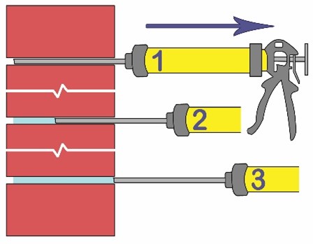 After removing the skirting boards, paneling and affected plasters on the wall, you can proceed with the injection. To do this, drill horizontal holes with a diameter of 12 or 14 mm and a distance of 10 to 12 cm at an angle of 10° to 15°. Insert the syringe completely to the end of the borehole and retreat a few cm. Squeeze the gun handle gently and, as you gradually pull the gun back, completely fill the borehole with the RC Drygel 80 to 1 cm from the wall surface. The boreholes should be closed afterwards with RC 221.