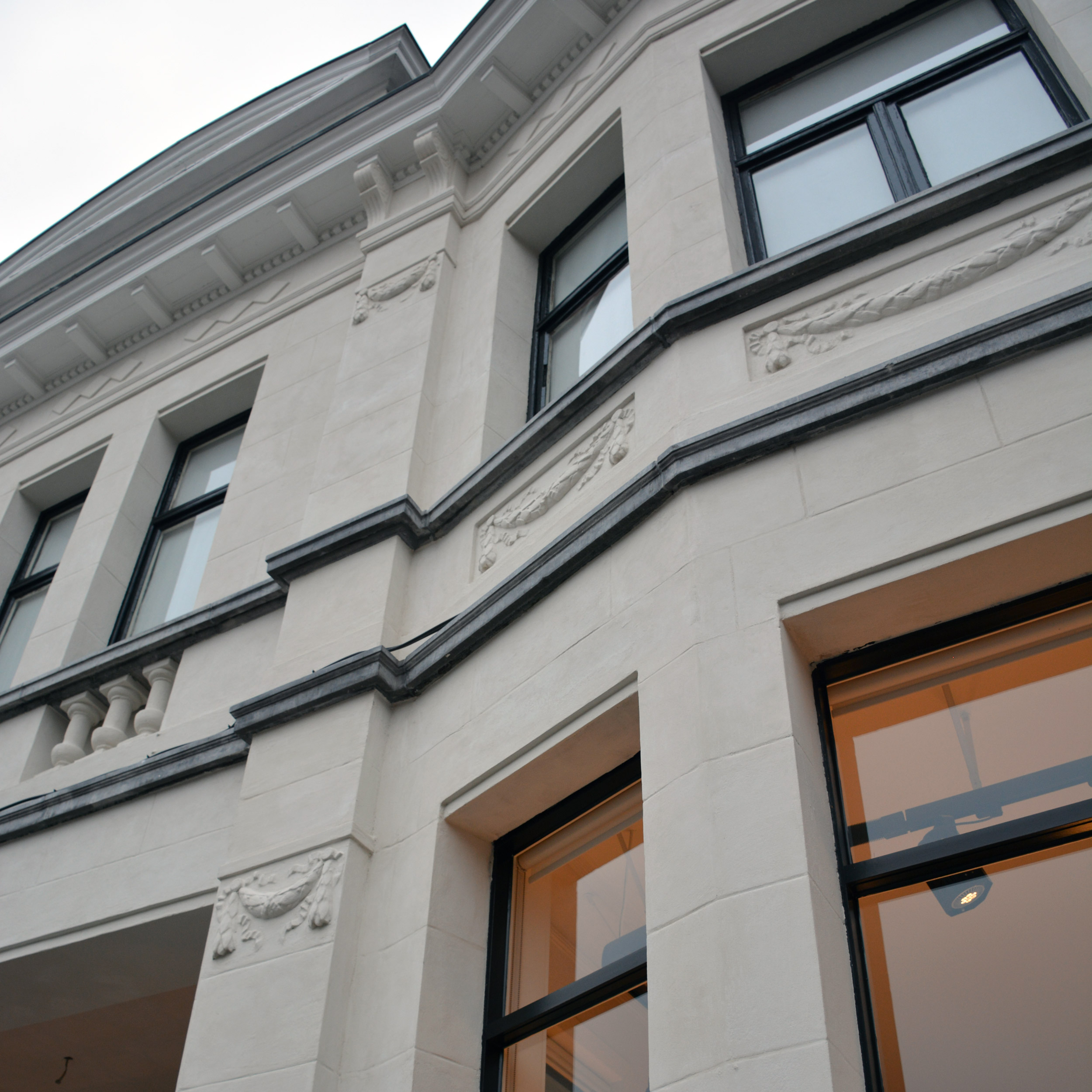Voor het opfrissen van de bepleisterde lijstgevel werd gekozen voor RC Nautil Mono in kleur P1. Deze decoratieve micromortel op basis van natuurlijke hydraulische kalk (NHL 3.5) zorgt voor een egaal gevelbeeld met de uitstraling van natuursteen. RC Nautil Mono is cementvrij, dampopen en uitermate geschikt voor renovatie en restauratie van gevels, natuursteen, baksteen en architecturale details.